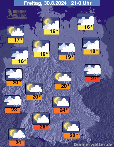 In der Nacht zum Samstag zeigt sich der Himmel auf einem Streifen vom Westen über Mitte bis in die Osthälfte stark bewölkt und es muss mit einzelnen Schauern gerechnet werden. Nördlich und südlich davon ist es meist wolkig, teils auch gering bewölkt, und es bleibt meist trocken.