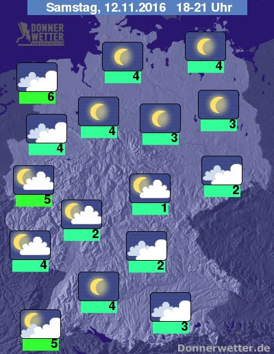 In der Nacht zum Sonntag ist es zunächst noch überwiegend locker oder aufgelockert bewölkt, nach Osten und Nordosten hin auch verbreitet sternenklar. Im Laufe der Nacht zieht sich der Himmel über der Westhälfte mehr und mehr zu, jedoch bleibt es im ganzen Land trocken. Die Temperatur sinkt auf 3 Grad an der Nordsee und bis -4 Grad im Thüringer Becken.
