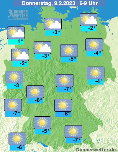 Die Temperaturen gehen in den Frühstunden auf Werte um -2 bis -7 Grad im Flachland zurück; lokal frostfrei bleibt es an der Nordseeküste.