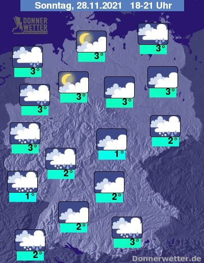 Heute Abend ist es im Norden teils stark, teils aufgelockert bewölkt, aber überwiegend trocken. Im Rest des Landes halten sich hingegen verbreitet dichte Wolken und es fällt vielerorts Regen, zunehmend jedoch Schneeregen oder Schnee. Die Temperatur liegt bei 1 Grad in Erfurt und bis 3 Grad in Köln.