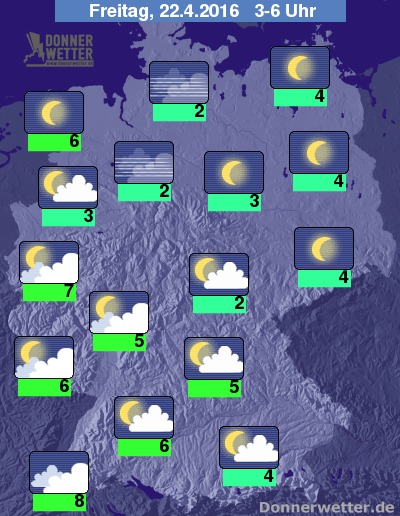 In der Nacht zum Freitag bleibt es im Norden und Osten noch weitgehend sternenklar, bevor am Morgen auch hier gebietsweise lockere Wolken aufziehen. Weiter nach Südwesten hin zeigt sich meist lockere bis aufgelockerte, im Alpenvorland jedoch auch häufig dichte Bewölkung, dazu bleibt es trocken. Die Temperatur sinkt auf 8 Grad in Freiburg und bis 2 Grad im Thüringer Becken.