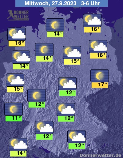 In der folgenden Nacht ist es zeitweise sternenklar, es zieht phasenweise aber auch leichte Bewölkung durch, dazu bleibt es trocken. Die Temperatur sinkt auf 17 Grad in Dresden und bis 11 Grad in Saarbrücken.