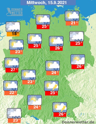 Am Mittwoch zeigt sich das Wetter überwiegend stark bewölkt, Auflockerungen sind zumindest möglich. Es bilden sich zeitweise Schauer, örtlich können sich auch einzelne Gewitter entwickeln. Die Temperatur steigt auf 18 Grad an der Nordsee und bis 27 Grad im Rheinland.