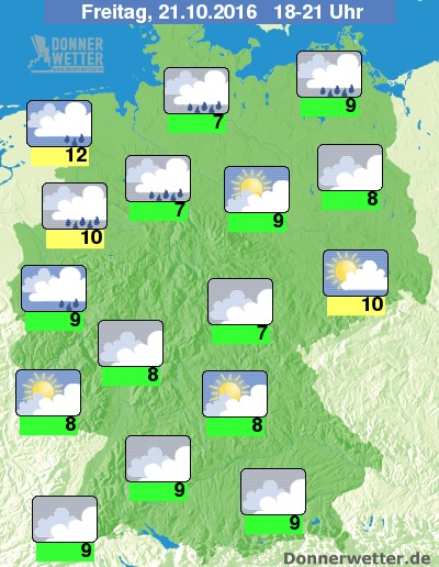 Heute Abend bleibt es bei weitgehend starker Bewölkung, dazu fällt im Norden und Westen zeitweise Regen. Im übrigen Bundesgebiet ist es zumindest gebietsweise auch aufgelockert bewölkt und sonst jedoch ebenfalls stark bewölkt, aber trocken. Die Abendwerte liegen bei 7 bis 12 Grad.