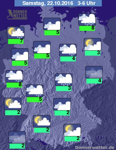 In der Nacht zum Samstag ist der Himmel über Süddeutschland meist nur locker bewölkt oder sogar sternenklar, dazu bleibt es trocken. In den übrigen Landesteilen zieht hingegen meist dichte Bewölkung durch, Auflockerungen sind aber möglich, jedoch fällt auch gebietsweise Regen. Die Temperatur sinkt auf 8 Grad in Rostock und etwa 2 Grad in Freiburg.