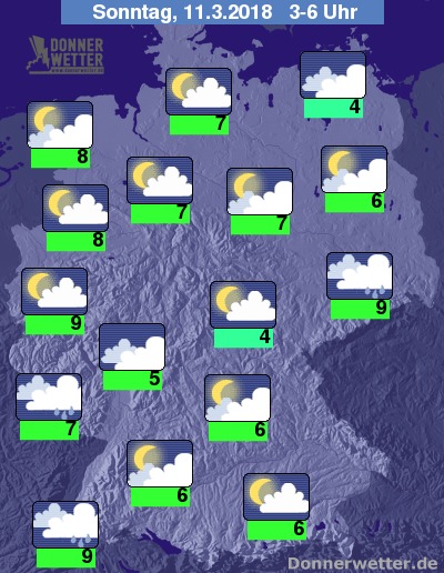 In der Nacht zum Sonntag klingen letzte Niederschläge meist rasch ab, vor allem entlang des Mittel- und Oberrheins sowie am Erzgebirge fällt bis zum Morgen noch gebietsweise Regen, sonst lockert es verbreitet auf. Vom Norden bis zur Mitte des Landes ist es häufig nur gering bewölkt. Die Temperatur sinkt auf 9 Grad im Oberrheingraben und bis 4 Grad im Thüringer Becken.