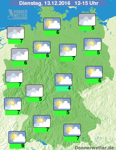 Heute Nachmittag zeigt sich der Süden und Osten Deutschlands oft aufgelockert, zum Teil jedoch auch stark bewölkt, aber trocken. Über dem übrigen Bundesgebiet ist es zum Großteil stark bewölkt, Auflockerungen mit Sonnenschein sind aber immer wieder möglich, gebietsweise fällt allerdings auch Regen. Die Temperatur steigt auf 4 Grad im Vogtland und bis 9 Grad im Breisgau.