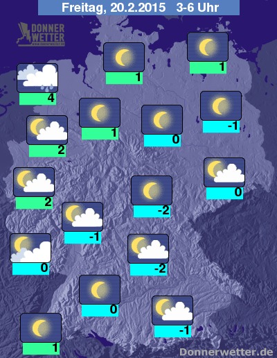In der Nacht zum Freitag bleibt es zum Großteil sternenklar. Vor allem im Westen und Nordwesten, aber auch in der Mitte und im Süden ziehen jedoch zunehmend Wolken auf, dazu bleibt es zunächst überall trocken. Gegen Morgen fällt unter dichten Wolken im Nordwesten und im äußeren Westen der Republik zeitweise Regen, in den übrigen Landesteilen bleibt es trocken. Vor allem im Süden und Osten kann sich stellenweise Nebel oder Hochnebel bilden. Die Tiefstwerte liegen bei 4 Grad an der Nordseeküste und um -2 Grad entlang der Donau.