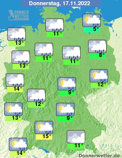 Am Donnerstag bleibt es verbreitet stark bewölkt oder bedeckt, dazu bilden sich einzelne Schauer. Die Temperatur steigt auf nur 5 Grad in Vorpommern und bis zu 15 Grad im Stuttgarter Raum. Im Norden weht ein teils stürmischer Wind, an der See herrscht verbreitet Sturm.