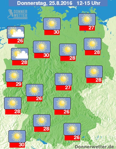 Heute Nachmittag scheint die Sonne über dem Bundesgebiet von einem verbreitet wolkenlosen Himmel. Einzig im Umfeld der Nordsee und der Ems können ein paar lockere Wolken durchziehen, dazu bleibt es trocken. Die Temperatur steigt auf 26 Grad in Augsburg und bis etwa 30 Grad im Oberrheingraben.