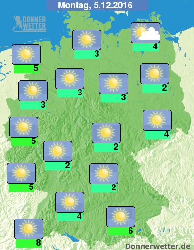 Zum Start in die neue Woche scheint über dem Land verbreitet die Sonne von einem überwiegend wolkenlosen Himmel. Hier und da können aber auch lockere Wolken vorüberziehen, am meisten im Umfeld der Ostsee. Es bleibt landesweit trocken. Die Temperatur steigt auf Werte zwischen 2 und 5, im Süden auf bis zu 8 Grad.