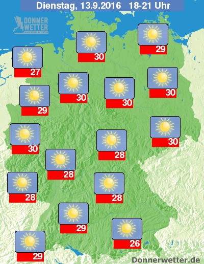 Heute Abend zeigt sich der Himmel über der Republik praktisch ausnahmslos sonnig, dabei bleibt es bundesweit trocken. Die Temperatur liegt noch bei 27 Grad in Emden und bis 30 Grad in Berlin.