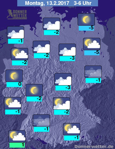 Am Montag bleibt es vor allem im Norden und Osten häufig noch längere Zeit stark bewölkt oder trüb, sonst strahlt über weiten Landesteilen jedoch die Sonne bei teils heiterem, teils sogar sonnigem Wetter, dabei bleibt es landesweit trocken. Die Temperatur steigt auf 0 Grad in Stralsund und bis 8 Grad in Konstanz.