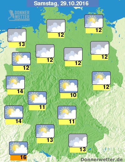 Am Samstag ist es im Norden, aber auch im Süden und Osten häufig stark bewölkt oder trüb, Aufheiterungen sind hier dennoch möglich, zudem bleibt es trocken, sonst zeigt sich das Land oft heiter bis wechselnd bewölkt, im Westen und Südwesten auch sonnig, dazu bleibt es trocken. Die Temperatur steigt auf recht milde 10 bis 16 Grad.
