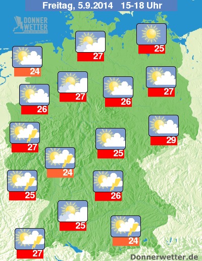 Heute Nachmittag bleibt es im Norden und Osten des Landes bei meist lockerer bis aufgelockerter Bewölkung trocken, vor allem im Ostseeumfeld ist es häufig sonnig. Besonders im Süden, aber gebietsweise auch im Westen ziehen dichte Wolken auf, dabei sind regional Schauer und Gewitter möglich, sonst bleibt es weitgehend trocken. Die Temperaturen liegen bei 24 Grad im Allgäu und bei sommerlichen 29 Grad in der Lausitz.