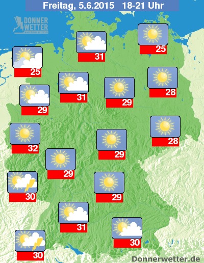Die Temperaturen liegen am Abend bei Werten um 25 Grad C in Ostfriesland und um 32 Grad C im Rheinland.