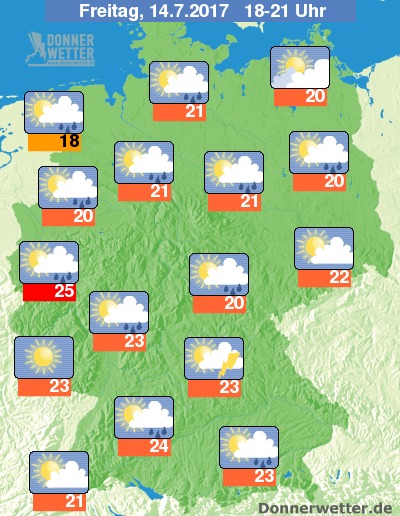 Heute Abend zeigt sich vor allem im Südwesten und über Mecklenburg-Vorpommern häufig die Sonne und hier bleibt es auch meist trocken. Im großes Rest der Republik sind zwar hier und da heitere Abschnitte, jedoch auch kompakte Wolken mit Schauern und örtlichen Gewittern möglich. Die Temperatur liegt bei 18 Grad an der Nordsee und bis 25 Grad in der Kölner Bucht.