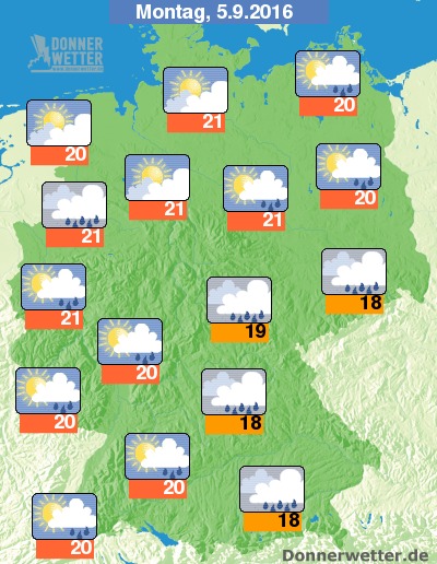 Am Montag bleibt es vor allem über der Südosthälfte noch überwiegend stark bewölkt und es bilden sich wiederholt, zum Teil auch kräftige Schauer. Im Westen ist es teils stark, teils aufgelockert bewölkt, hier sind Schauer insgesamt seltener. Im Norden ist es indes am freundlichsten, denn hier kommt immer besser die Sonne zum Zuge, dabei bleibt es größtenteils trocken. Die Temperatur steigt auf 18 Grad in Unterfranken und bis 21 Grad am Niederrhein.