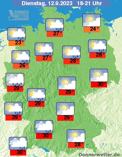 Heute Abend zieht eine große Schauer- und Gewitterfront von Nordwesten her übers Land. Über Bayern und Sachsen bleibt es bei meist aufgelockerter Bewölkung aber noch meist trocken. Die Temperaur liegt bei 23 Grad in Cuxhaven und 30 Grad in Stuttgart.