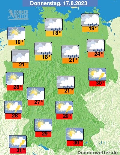 Am Donnerstag halten sich vor allem im Norden und Nordosten oft dichte Wolken und es bilden sich gebietsweise Schauer. Im übrigen Land ist es teils heiter, teils stark bewölkt und es besteht ein leichtes bis mäßiges Schauer- und Gewitterrisiko. Die Temperatur erreicht 19 Grad an den Küsten und bis 31 Grad im Breisgau.