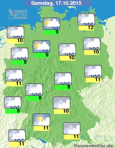 Am Samstag ist es über Süddeutschland hier und da aufgelockert, häufig aber auch stark bewölkt, jedoch weitgehend trocken. Weiter nach Norden hin zeigt sich die Sonne hingegen nur sehr selten und es ziehen überwiegend dichte Wolken durch, die zeitweise für Regen sorgen. Die Temperatur steigt auf 8 Grad im Coburger Land und bis 12 Grad in Rostock.