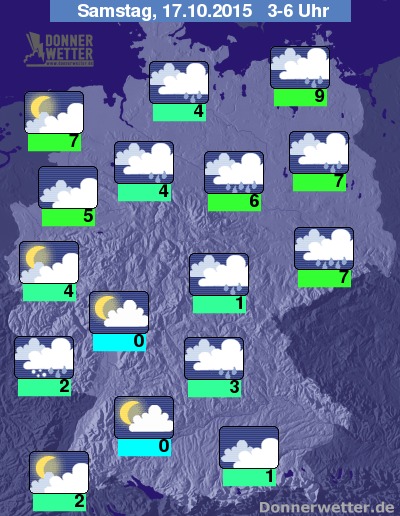 In der folgenden Nacht ziehen über die Osthälfte und über den Norden Deutschlands meist dichte Wolken hinweg und es fällt zeitweise Regen. Im äußeren Südwesten und Westen ziehen ebenfalls oft dichte Wolken mit Regen durch. Im übrigen Bundesgebiet ist es teils locker, teils stärker bewölkt, aber dabei meist trocken. Die Temperatur sinkt auf 9 Grad in Neubrandenburg und bis Werte um 0 Grad an der Schwäbischen Alb. Stellenweise ist zum Morgen Glätte durch überfrierende Nässe oder Rauhreif möglich.