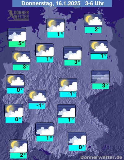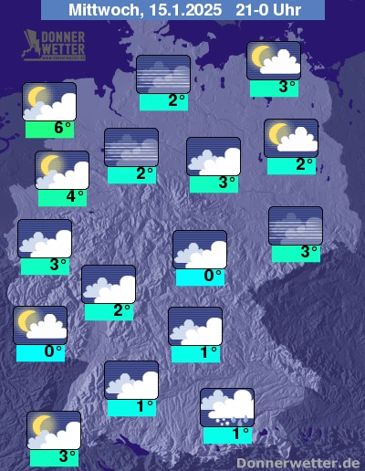 In der Nacht zum Donnerstag bleibt der Himmel über weiten Landesteilen stark bewölkt oder es ist bedeckt, größere Wolkenlücken beschränken sich im Nachtverlauf am ehesten auf die Südhälfte. Gebietsweise kann sich Nebel bilden. An den Alpen nachlassende Schneefälle, auch sonst bleibt es überwiegend trocken.