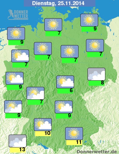 Am Dienstag wird es verbreitet heiter und bevorzugt in der Nordhälfte des Landes auch häufig sonnig, weiter nach Süden ziehen meist lockere Wolkenfelder durch. Dichtere Wolken halten sich vor allem im Südwesten, aber auch im äußersten Westdeutschland, sowie am Fuße des Erzgebirges, dabei bleibt es aber trocken. Die Temperatur steigt auf 6 Grad am Thüringer Schiefergebirge und bis auf milde 13 Grad im Breisgau.