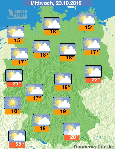 Die Höchsttemperaturen bewegen sich am Nachmittag zwischen 15 und 19 Grad, regional werden sogar spätsommerliche Werte zwischen 20 und 24 Grad erreicht, bei dichterer Bewölkung oder Nebel bleibt es jedoch dementsprechend kühler.