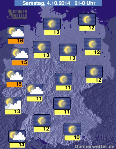 Heute Abend bleibt der Himmel überwiegend klar, im äußeren Westen der Republik ziehen aber nach und nach mehr Wolken auf, dabei bleibt es aber ebenfalls trocken. Die Abendtemperaturen liegen bei 16 Grad am Niederrhein und rund 10 Grad in Oberbayern.