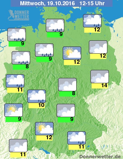 Am Nachmittag und frühen Abend ändert sich an dem Wetterbild nur wenig. Im  Westen und entlang der Weser regnet es teils stark und die Sonne schafft es nur selten durch die Wolkendecke. Im restlichen Land ist es überwiegend bedeckt. In Brandenburg und Thüringen zeigt sich öfter mal die Sonne.