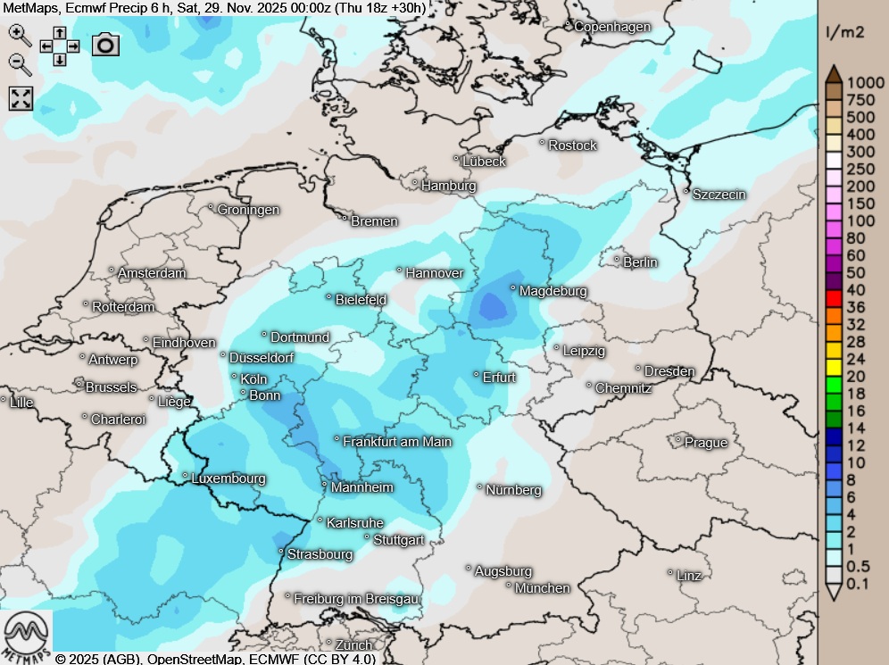 Die Temperatur- und Wetterkarte für 15:00 Uhr sowie die Sechs-Stunden-Regenmengen bis 00:00 Uhr nach ECMWF: