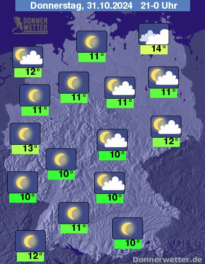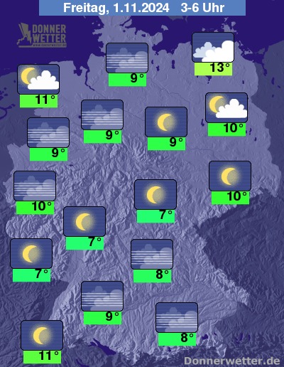 In der Nacht zum Freitag bleibt der Himmel über dem Norden häufig stark bewölkt oder es ist bedeckt, phasenweise kann etwas Sprühregen fallen. In den übrigen Landesteilen ist es anfangs sternenklar oder nur gering bewölkt; in den frühen Morgenstunden bildet sich dann verbreitet Nebel.