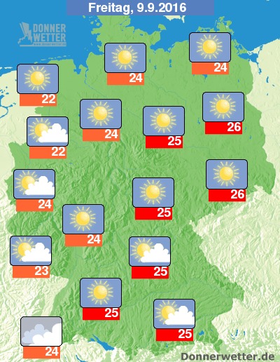Am Freitag sind vor allem in den westlichsten Landesteilen sowie im Südosten der Republik gebietsweise einige, meist lockere Wolken möglich, dabei sind im Tagesverlauf am Alpenrand auch hier und da Schauer und vereinzelte Gewitter möglich, sonst bleibt es trocken. Im übrigen Bundesgebiet ist es mehrheitlich sonnig und sonst zieht nur lockere Bewölkung durch, dazu bleibt es trocken. Die Temperatur steigt auf 22 Grad im nördlichen Emsland und bis 26 Grad in der Lausitz.