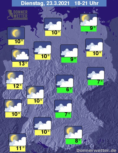 Heute Abend bleibt es bei oft starker, über der Westhälfte vielerorts auch lockerer bis aufgelockerter Bewölkung überall trocken. Die Temperatur liegt bei 6 Grad in Erfurt und bis 13 Grad in Münster.