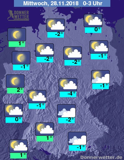 In der Nacht zeigt sich der Himmel über weiten Landesteilen zunächst noch locker oder aufgelockert bewölkt. Bis zu den frühen Morgenstunden klart es dann aber verbreitet auf, lockere Wolkenfelder halten sich dann vor allem noch entlang der Rheins, an der Oder sowie im Alpenvorland. Regional kann sich Nebel bilden, Schauer sind nicht zu erwarten.