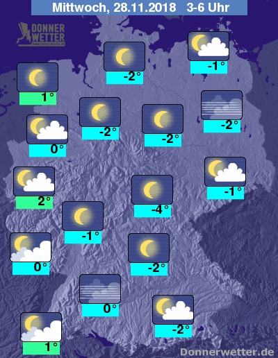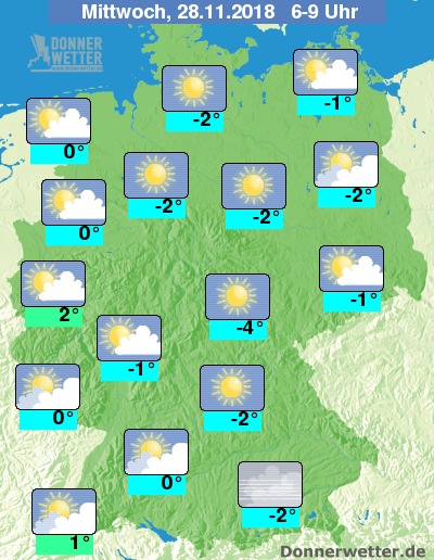 Der Mittwoch startet dann vor allem entlang von Weser und Elbe sowie in den mittleren Landesteilen mit viel Sonnenschein. Ansonsten überwiegt ein Mix aus Sonne und Wolken, am Alpenrand auch Nebel. Schauer sind bei Werten um -4 bis +2 Grad C weiterhin nicht zu erwarten.