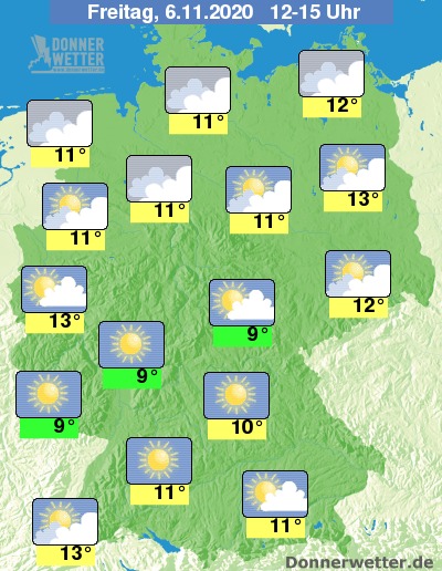 Am frühen Nachmittag ziehen über den Norden teilweise dichtere Wolken hinweg. Sonst scheint abgesehen von regionalen Nebelfeldern oder tiefhängender Bewölkung für längere Zeit die Sonne.