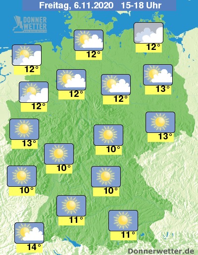Bis zum frühen Abend gibt es auch im Norden größere Lücken für die Sonne. Lediglich im Ostseebereich bleibt die Wolkendecke dicht. In der Mitte und im Süden gestaltet sich der Himmel außerhalb lokaler Nebelzonen wolkenlos oder nur gering bewölkt.