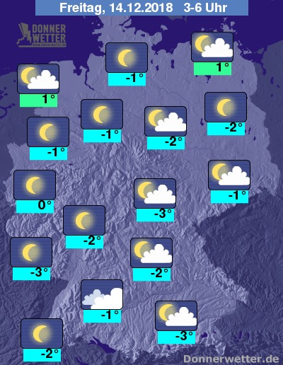 Bis zu den Frühstunden kühlt die Luft auf frostige -4 bis 0 Grad ab. Lediglich im Küstenbereich von Nord- und Ostsee halten sich die Werte im leicht positiven Bereich auf.
