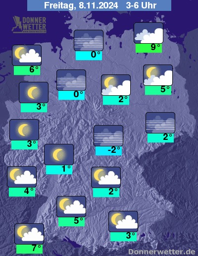 In der Nacht zum Freitag ist der Himmel über dem Westen und dem höheren Bergland verbreitet sternenklar oder nur gering bewölkt. In den übrigen Landesteilen bildet sich erneut flächendeckend Nebel oder Hochnebel, lokal ist etwas Sprühregen möglich.