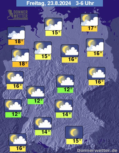 Die Temperaturen gehen in den Frühstunden zurück auf Werte um 18 bis 12 Grad.