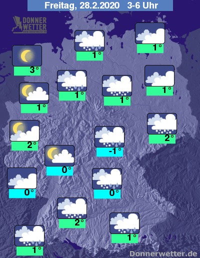 Bis zu den Frühstunden kühlt die Luft auf 0 bis 3 Grad ab, stellenweise gibt es leichten Frost. Achtung, es muss verbreitet mit Straßenglätte durch Schnee, Schneematsch oder überfrierender Nässe gerechnet werden.