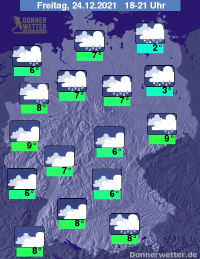 Heute Abend bleibt es weitgehend bedeckt und bevorzugt über dem Alpenvorland und über der Nordhälfte fällt gebietsweise Regen. Im Nordosten fallen die Niederschläge auch als Schneeregen oder Schnee, sonst bleibt es zum Großteil trocken. Die Temperatur liegt bei 2 Grad in Neubrandenburg und etwa 9 Grad in Köln.