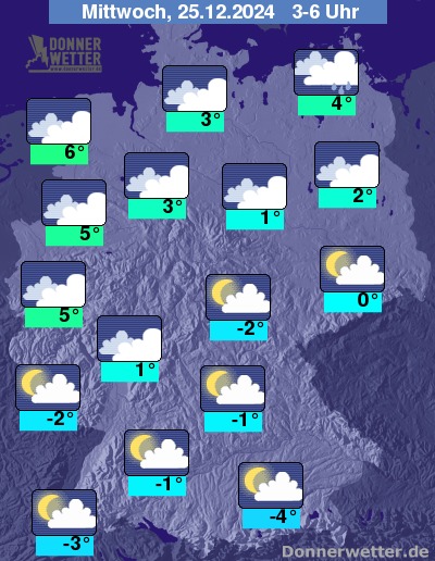 Am 1. Weihnachtsfeiertag ist es vor allem an den Alpen oft heiter, aber auch im übrigen Süden kann sich gebietsweise die Sonne zeigen, dabei bleibt es trocken. Weiter nach Norden hin ist es hingegen meist bedeckt, dabei fällt im Nordosten etwas Regen, sonst bleibt es weitgehend trocken. Die Temperatur steigt auf 2 Grad in Oberbayern und bis 9 Grad im nördlichen Emsland.