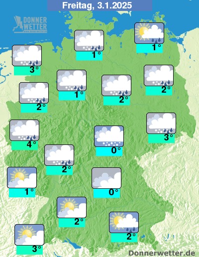 Heute zieht häufig starke, gebietsweise aber auch wechselnde bis aufgelockerte Bewölkung durch, dabei bilden sich zeitweise Schnee- oder Schneeregenschauer. Die Höchstwerte erreichen 0 Grad in Mittelfranken und bis 4 Grad im Rheinland. Über der Nordhälfte Deutschland weht ein starker und teils stürmischer Wind.