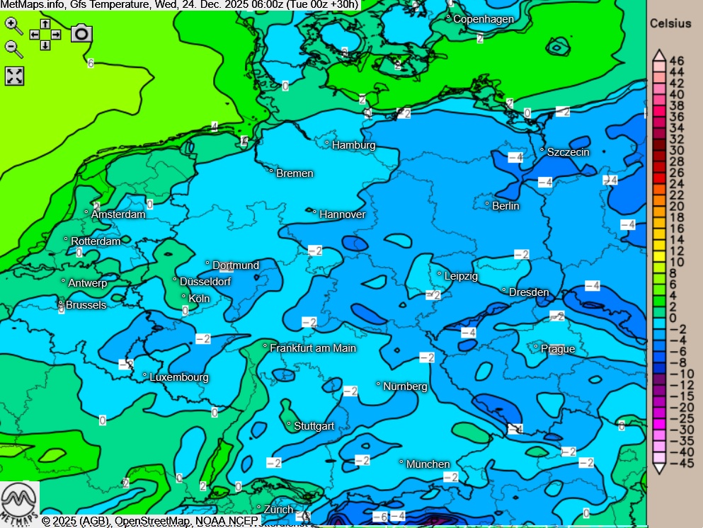 An Heiligabend zeigt sich der Himmel über der Südhälfte Deutschlands sowie über dem Südosten überwiegend bedeckt. Dabei gibt es stellenweise etwas Schneegriesel oder leichten Schneefall, in tieferen Lagen lokal auch zunächst mit Regen vermischt. Im Tagesverlauf klingen die Niederschläge allmählich ab.