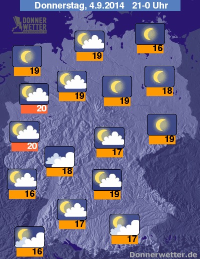 Heute Abend zeigen sich viele Landstriche im Norden und Nordosten des Landes sternenklar, auch im Nordwesten wird es zeitweise klar sein, sonst zieht meist lockere Bewölkung durch. Besonders im Süden und Südwesten können die Wolken aber auch dicht sein, Regen fällt trotzdem nur selten. Die Temperatur liegt bei etwa 20 Grad am Niederrhein und um 16 Grad an der Müritz.