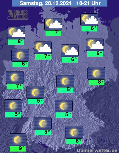 In der Nacht zum Sonntag ziehen im Nordseeumfeld dichte Wolken auf, wobei sie nur selten ein paar Tropfen bringen. Im übrigen Norden ist es meist leicht bis wechselnd bewölkt und trocken. Im übrigen Bundesgebiet zeigt sich der Himmel weitgehend sternenklar, dazu bleibt es trocken. Die Temperatur sinkt auf 5 Grad in Cuxhaven und bis -3 Grad in Saarbrücken.