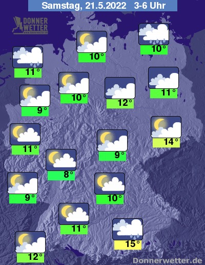 In der Nacht zum Samstag ist der Himmel zumeist wechselnd bis aufgelockert, vor allem im Norden, aber auch im Südosten oft dicht bewölkt. Im Küstenumfeld bilden sich gebietsweise Schauer, selten auch Gewitter, im Südosten fällt hier und da etwas Regen. Die Temperatur sinkt auf 15 Grad in München und bis 8 Grad in Wiesbaden.